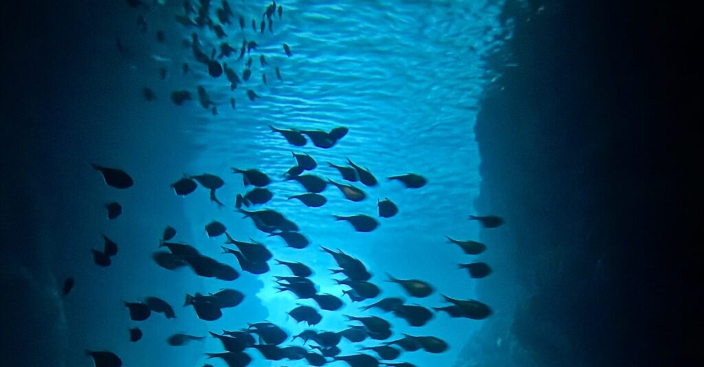 真栄田岬は「青の洞窟」としても有名です。水面からの光が洞窟に差し込む景色はとても幻想的です。