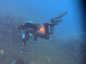 レック・ダイバーSPでは、沈船内部潜入に向けて、沈船の形状を調査したり、ペネトレーション(侵入)用のラインの設置の練習などを行います。一つひとつのスキルの難易度はそれほど高いものではないのですが、深場での作業のためNDLとの戦いにもなります。つまり、スキルを迷うことなくスピーディーに行う必要があります。かといって焦ってしまうと、呼吸が乱れ中性浮力に影響を与えてしまいます。そのバランスをしっかりとれるように練習を繰り返します。