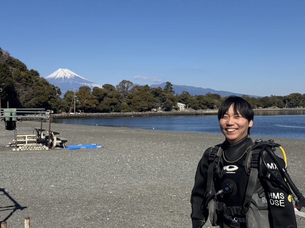 ダイバーのはじめのライセンス、オープンウォーターダイバー(OWD)講習を大瀬崎で行いました。天気に恵まれ、2日間とも富士山がしっかりと見えていました。
