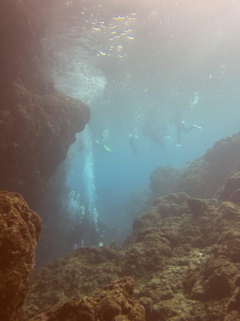 最初の写真をよく見ていただくと、いくつものボートが写っています。これは近くからダイビングやシュノーケル船として青の洞窟そばにきているものになります。どうしても体力に自信がない人はボートエントリーするのも選択肢の一つですね。
