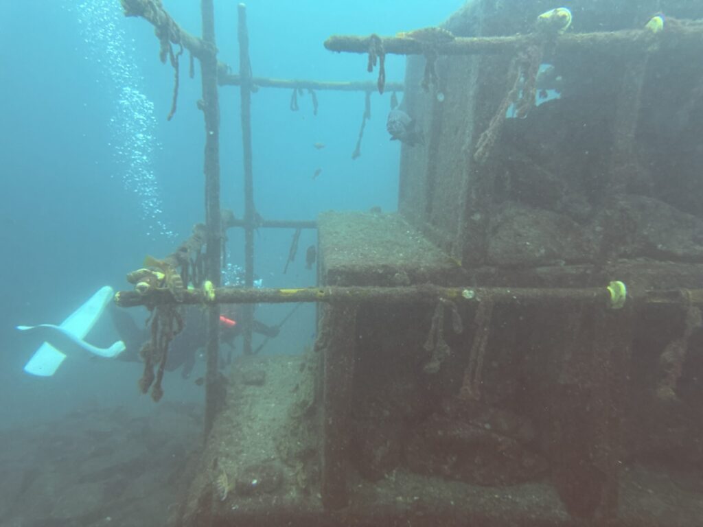 そのヤグラを通り越して先に進むと、水深18mとなります。さらに進んでボートあたりで20m、もっともっと進んで6タイヤで28mとなります。もう少し進むと30mを超えてきます。深さ的には十分ですし、NDLやエンリッチの場合の水深制限も十分に注意しなければなりません。